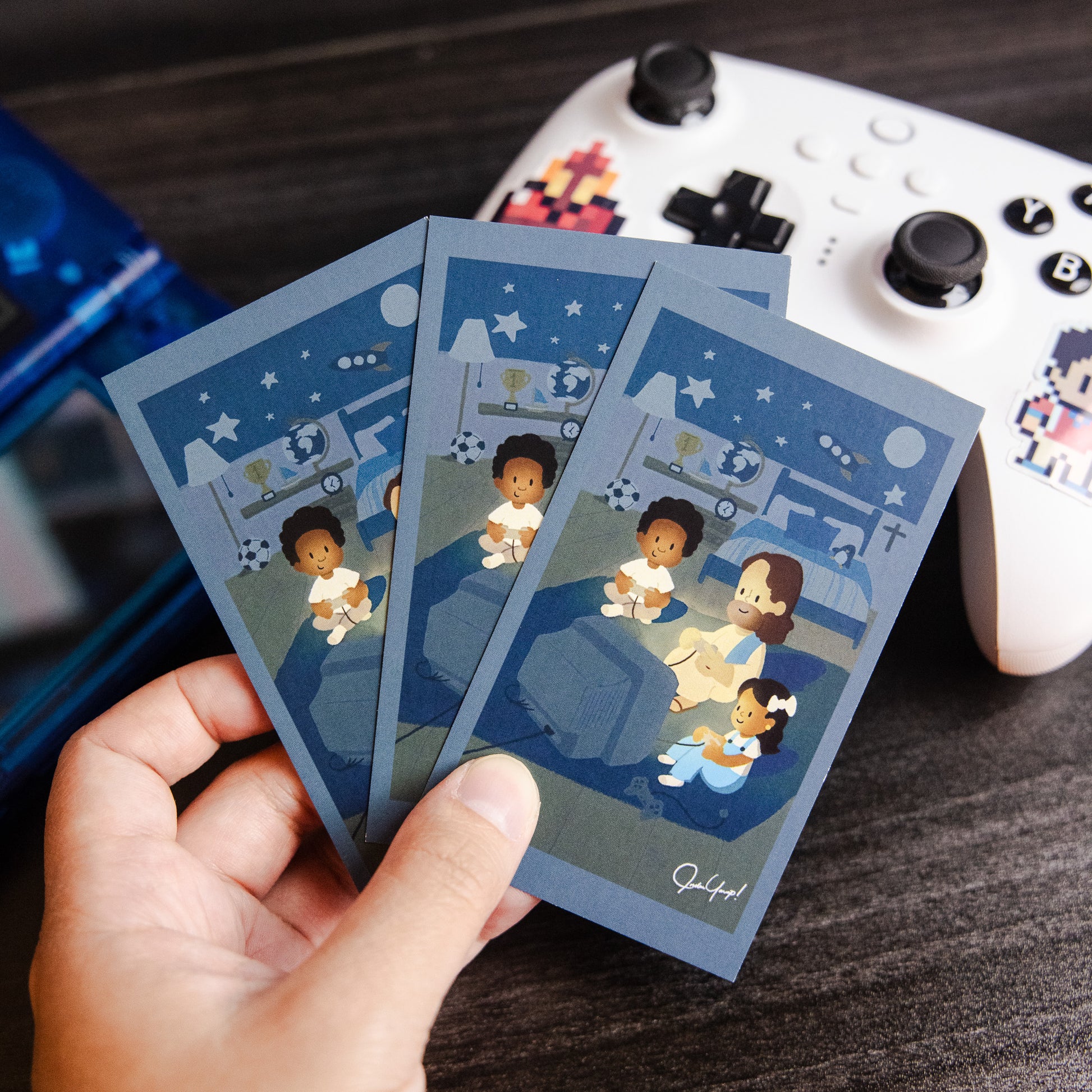 You discovered: 3 prayer cards for praying before video games! Perfect for Catholic gamers and kids to invite Jesus into your play before video games. Keep this prayer card on the go, next to your gaming consoles, or on your computer desk as a daily reminder of your adventure toward the Divine! Front artwork is by Catholic artist Jordan Yango and features Jesus playing video games with two children. Material: - 100# glossy card stock Dimensions: 4.125" tall x 2.375" wide Finish: Glossy/matte Looking for more saints to join your party? Check out more of our stickers here: https://www.etsy.com/shop/SaintSprites