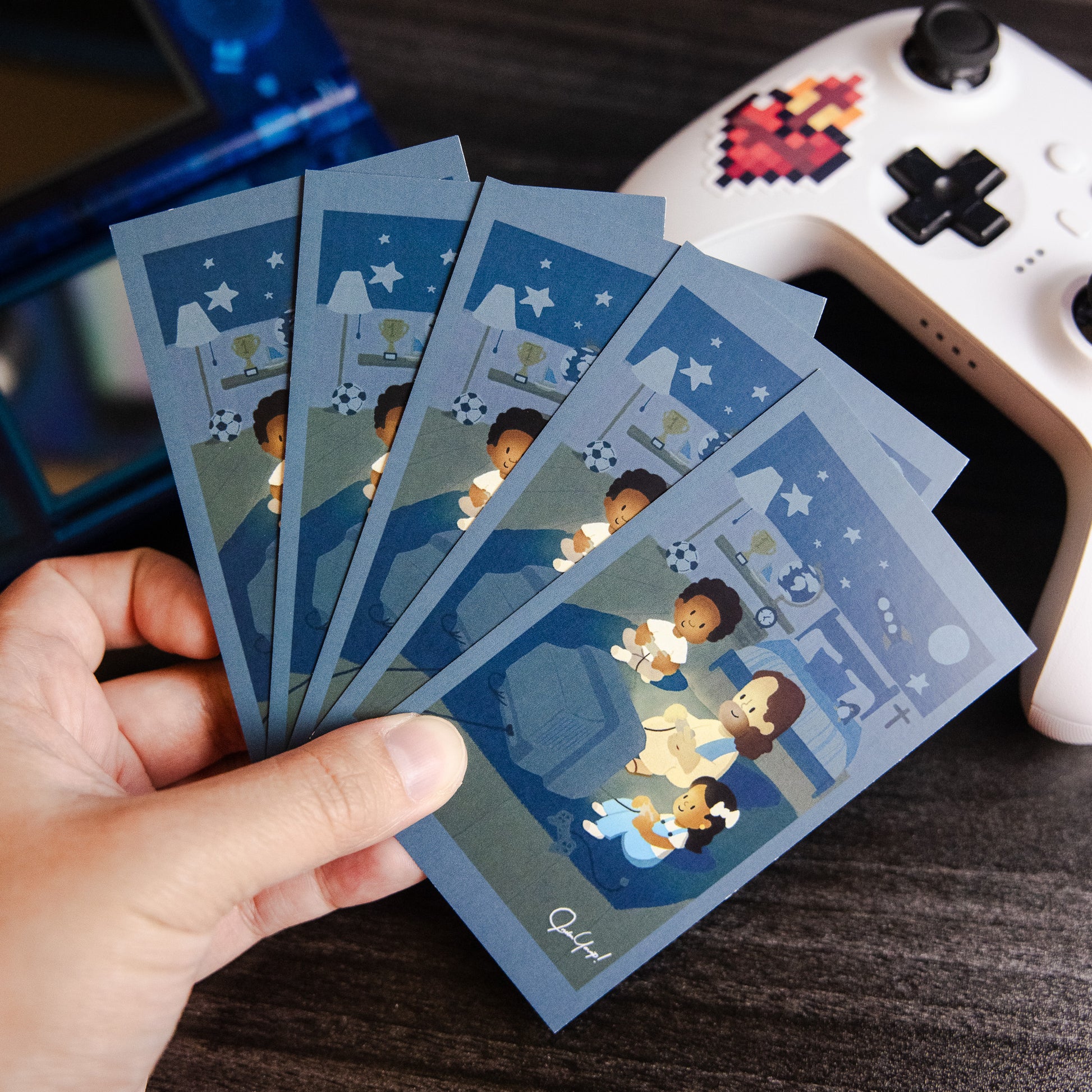 You discovered: 5 prayer cards for praying before video games! Perfect for Catholic gamers and kids to invite Jesus into your play before video games. Keep this prayer card on the go, next to your gaming consoles, or on your computer desk as a daily reminder of your adventure toward the Divine! Front artwork is by Catholic artist Jordan Yango and features Jesus playing video games with two children. Material: - 100# glossy card stock Dimensions: 4.125" tall x 2.375" wide Finish: Glossy/matte Looking for more saints to join your party? Check out more of our stickers here: https://www.etsy.com/shop/SaintSprites