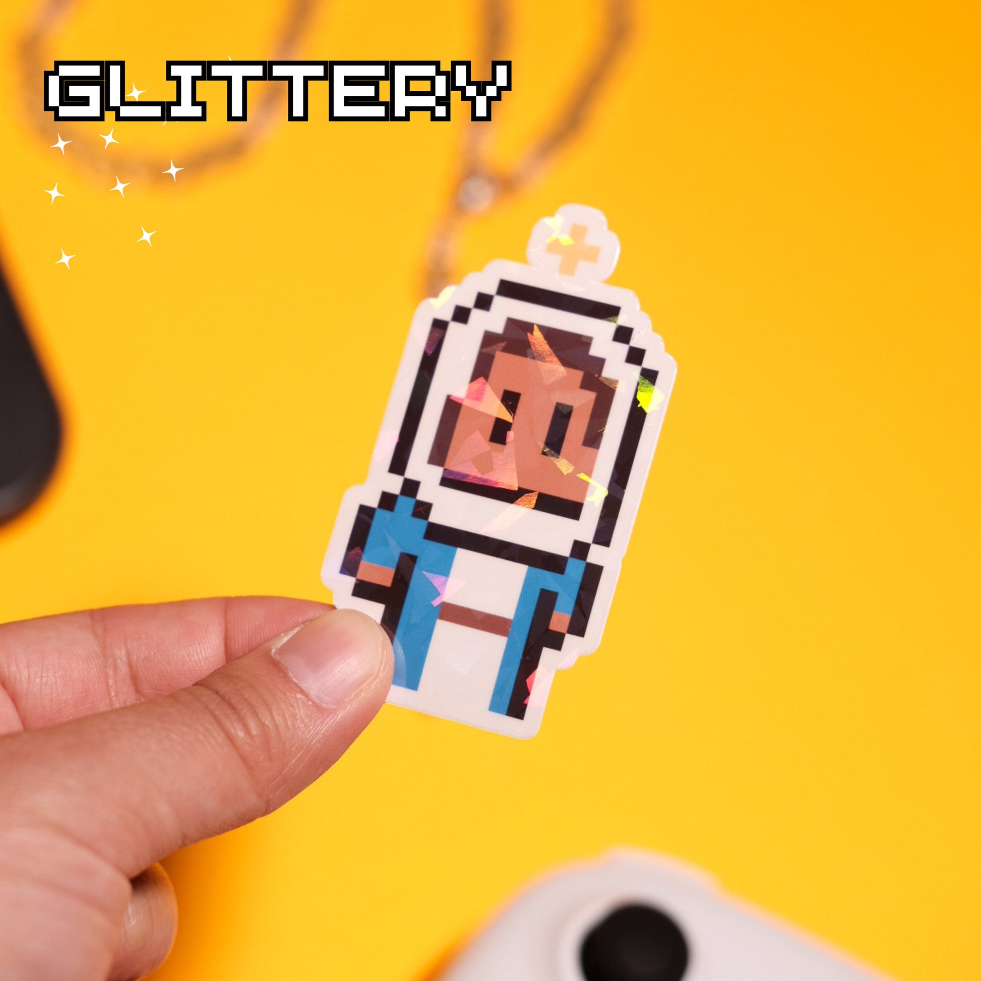 You discovered: An absolutely adorable glittery sticker of Mary, the Mother of God in pixelated, video-game form!